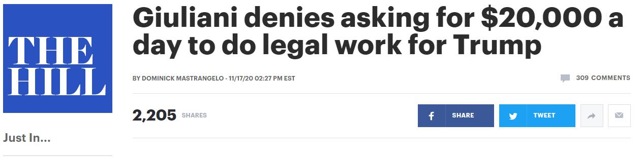 據《國會山報》17日報道,有美媒稱,作為特朗普發起選舉“法律戰”的負責人,朱利安尼要求總統競選團隊每天支付2萬美元的法律服務費。不過對於相關報道,朱利安尼予以否認。