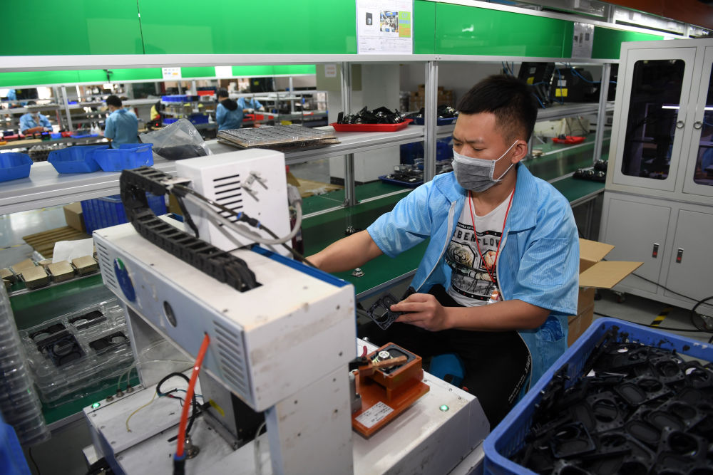 4月15日,中國-東盟自由貿易區憑祥物流園一家外貿企業的員工在生產出口海外的電子產品。新華社記者 陸波岸 攝