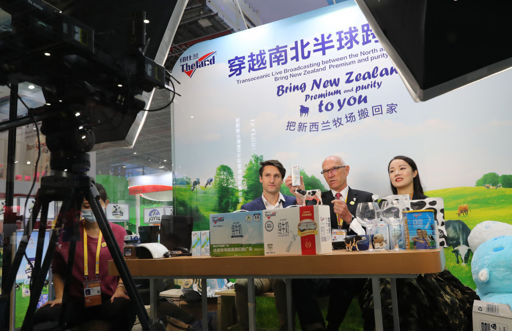 11月8日,新西蘭紐仕蘭乳業研發總經理羅伊·範登克(中)在進博會展台上搭建的網絡直播間出鏡帶貨。新華社記者 方喆 攝