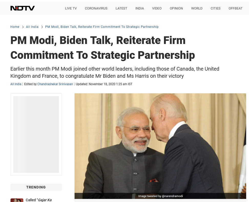 新德里電視台注意到,17日早些時候,印度外交部長蘇傑生談到了與“即將執政的”拜登政府間的積極關係,他稱,這位民主黨人對印度來説“並不陌生”。新德里電視台還稱,雙方除可能將在打擊恐怖主義、氣候變化以及抗擊新冠疫情上合作外,預計拜登還將支持印度尋求獲得聯合國安理會常任理事國席位的主張。