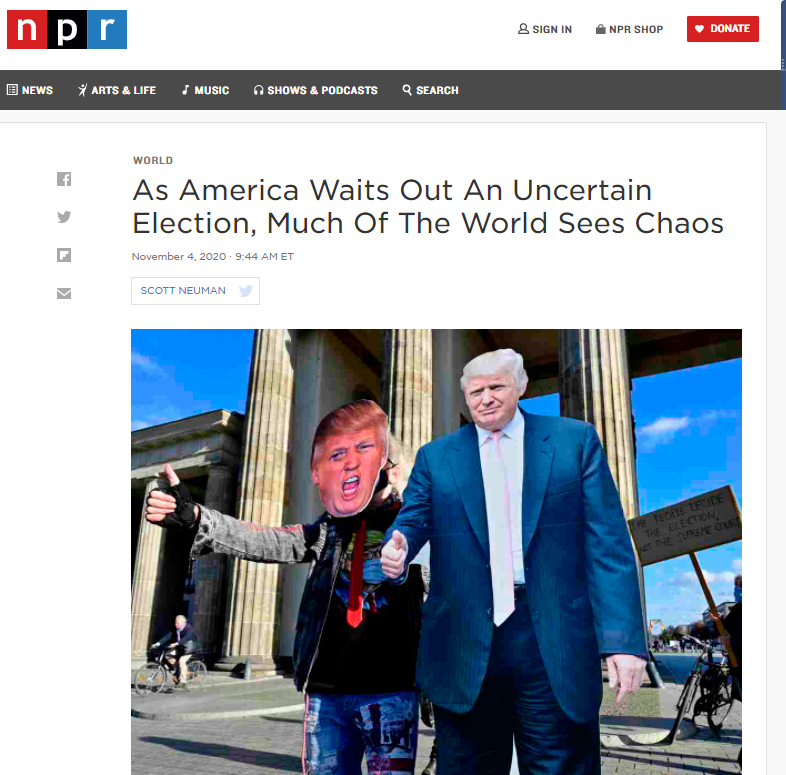 (圖為美國公共廣播網前不久對於美國大選的報道,稱全世界看到的是“混亂”)