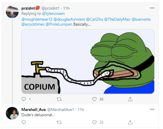 有網民還給送給這位美國大教授一個美國右翼分子的代表符號“青蛙佩佩”在吸食精神鴉片的表情包,來形容他文章中所展現出的這種妄想狂的狀態。