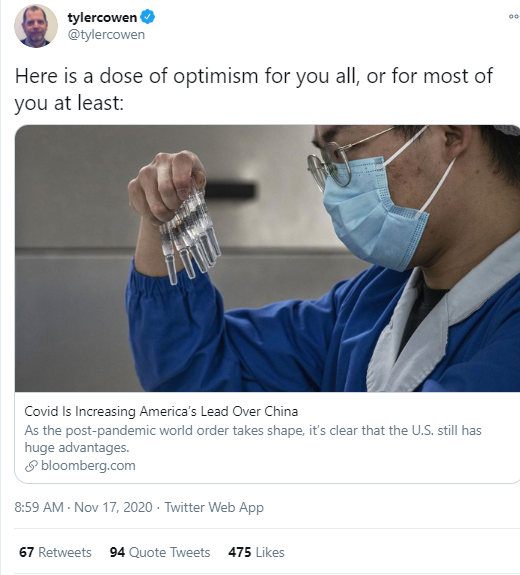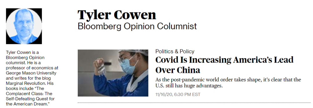 因為撰寫此文的一名美國大學教授居然宣稱:新冠疫情證明了美國比中國強大,而且比起中國有着“巨大”的優勢。