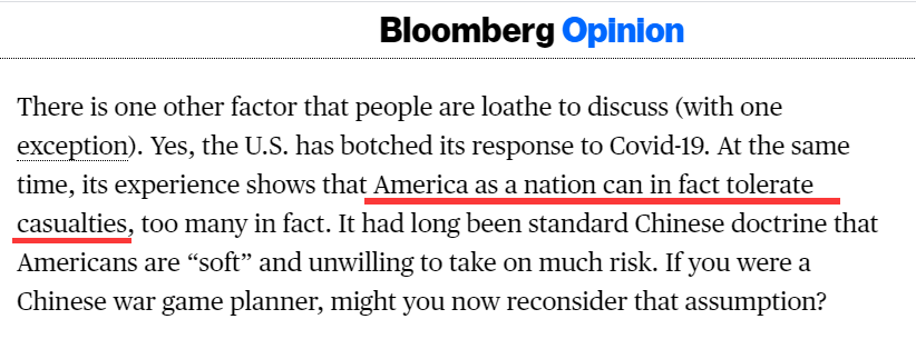 而最最噁心的是,這位美國大教授居然宣稱,雖然美國的新冠疫情應對搞砸了,但這也説明“美國不怕死人”,證明了美國不是中國所描述的“軟弱不堪”,而且美國的這種“不怕死人”,也將令中國製訂針對美國的軍事策略時不得不三思。