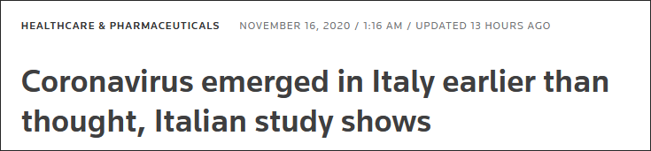 “忘記武漢吧!令人震驚的研究結果表明,早於2月之前的5個月新冠病毒就已經在意大利出現了。” 新加坡《商業時報》16日稱,在導致全球數千萬人感染和上百萬人死亡後,新冠病毒的起源仍然是個謎。世界仍然不知道它是如何變成“全球殺手”以及出現的確切時間。在疫情被宣佈為全球大流行疾病8個月後,一項新的研究表明該病毒早已存在於意大利。意大利米蘭國家癌症研究所11月15日發表研究報告指出,新冠病毒可能自2019年9月就已經在意大利傳播了,這不僅比意大利今年2月宣稱的第一例新冠肺炎病例早5個月,也比武漢在2019年12月首次報告該病毒早3個月。