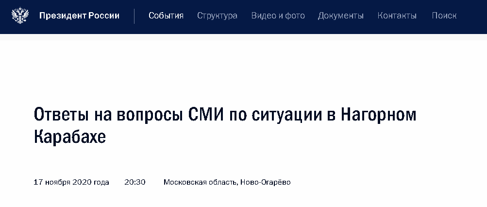 在當天的採訪中,普京披露了更多衝突調解的細節。普京介紹,10月19日至20日,各方實際已基本達成了停火協議,但最終沒有成功。普京強調,關於納卡地區停火的協議在一天之內製定,各方圍繞協議中每一個短語、每個逗號展開爭論,如果能早日達成目前的協議,就可以避免戰爭。