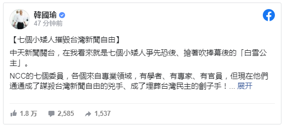 據台灣中時新聞網18日報道,韓國瑜當日在社交媒體臉書發文《七個小矮人摧毀台灣新聞自由》,寫道:“中天新聞關台,在我看來就是七個小矮人爭先恐後、搶着吹捧幕後的‘白雪公主’。NCC的七個委員,各個來自專業領域,有學者、有專家、有官員,但現在他們通通成了謀殺台灣新聞自由的兇手、成了埋葬台灣民主的劊子手!”.