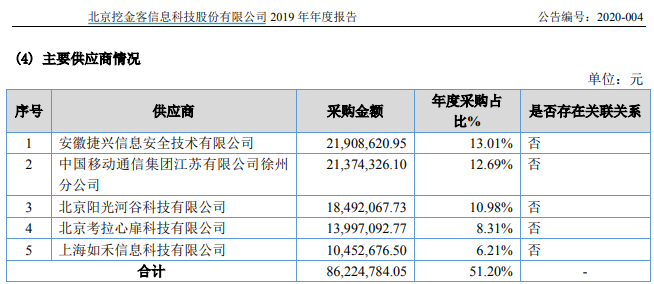 值得關注的是,挖金客原本是新三板掛牌公司,併發布過2019年年報。在本次發佈的招股書中,挖金客披露2019年第一大供應商為“北京陽光河谷科技有限公司”,涉及採購金額高達三千萬元以上,但是在此前發佈的2019年年中,卻披露對該供應商採購金額僅為1849.21萬元,前後相差近1500萬元;;與此同時的情形也發生在供應商“上海如禾信息科技有限公司”、“ 北京考拉心扉科技有限公司”等,兩板信息披露均存在較大差異,對此招股書中並未給出解釋。