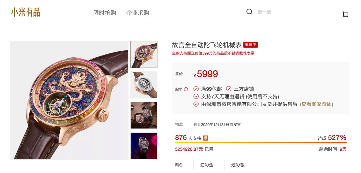 小米有品與《上新了故宮》聯名產品終於露面,在融合了紫禁城古典設計與表界最高科技後,推出的是全自動陀飛輪機械錶。現在該款手錶已經在小米有品眾籌限量發售,售價5999元,限量999只售完即止。
