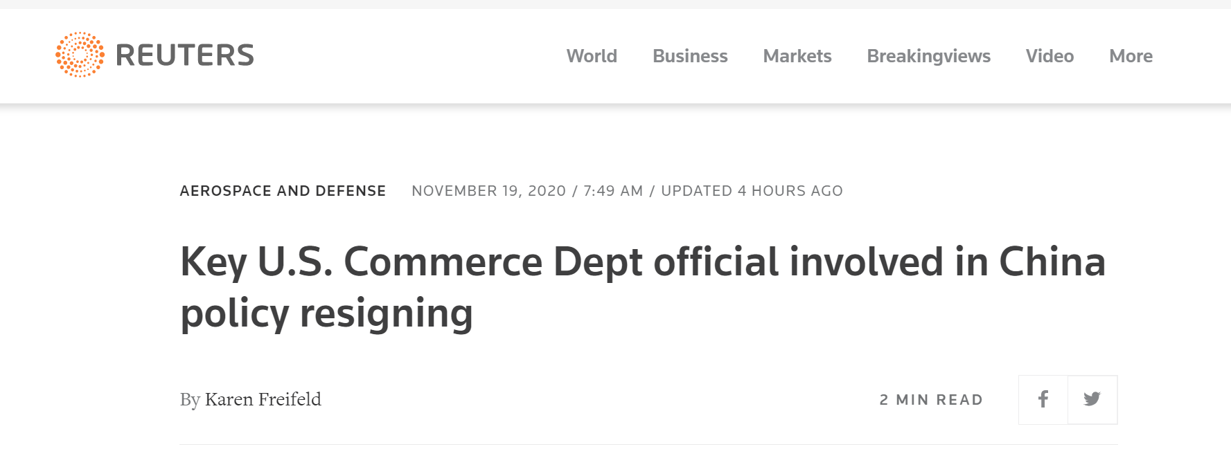▲路透社:美國商務部負責對華政策的主要官員將離職
