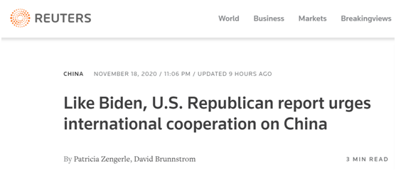 報道提到,特朗普任內對中國往往採取單方面行動,同時冒犯了歐洲與亞洲的盟友,指控他們國防事務不出錢出力,還恫嚇他們要追隨美國政策。然而,報道稱,特朗普在11月3日總統大選中敗給了民主黨籍的拜登,“將於(明年)1月20日接任美國總統”的拜登已經表示,需要重振美國與盟友間的關係,作為應對中國的核心力量。