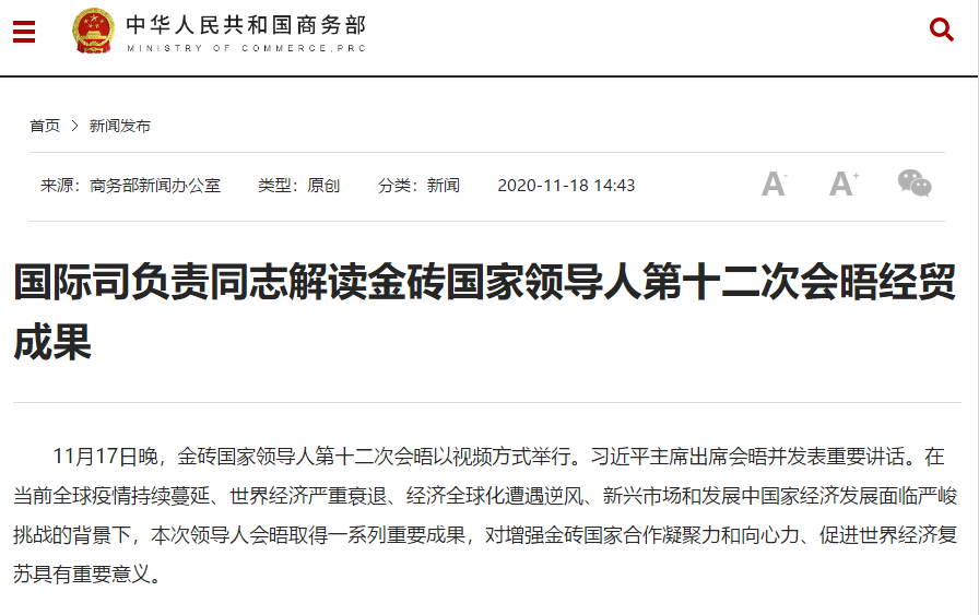 據商務部網站消息,11月17日晚,金磚國家領導人第十二次會晤以視頻方式舉行。習近平主席出席會晤並發表重要講話。在當前全球疫情持續蔓延、世界經濟嚴重衰退、經濟全球化遭遇逆風、新興市場和發展中國家經濟發展面臨嚴峻挑戰的背景下,本次領導人會晤取得一系列重要成果,對增強金磚國家合作凝聚力和向心力、促進世界經濟復甦具有重要意義。