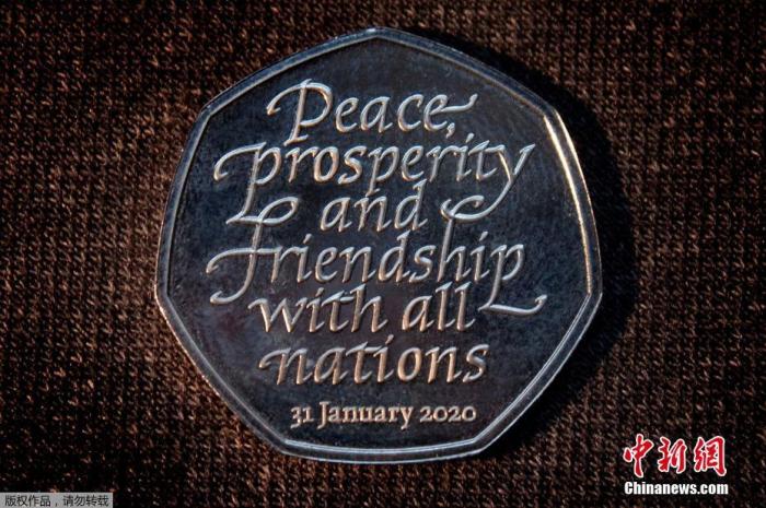資料圖:英國發行新鑄造的50便士硬幣,以紀念英國脱離歐盟。紀念幣上刻有“共享和平、繁榮和友誼”字樣,以及日期“2020年1月31日”。