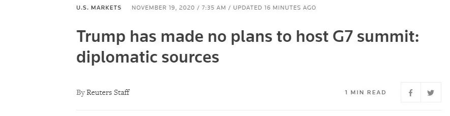 路透社剛剛消息,三名外交消息人士當地時間18日表示,由於新冠大流行取消了6月份的會議後,“即將離任的”美國總統特朗普目前沒有主辦七國集團(G7)峯會的計劃。