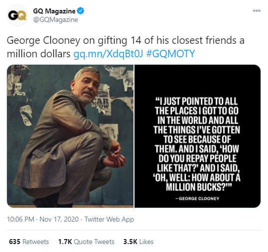 另外,喬治·克魯尼透露,就在給朋友們發完了這筆錢整整一年後,他就結婚脱單了。