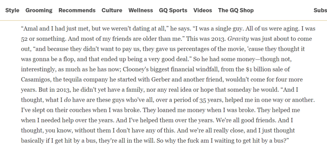 “在我沒錢的時候,我睡過他們的沙發;在我沒錢的時候,他們借過我錢;在我過去這些年需要幫助的時候,他們都在幫我……我們都是非常好的朋友。所以我覺得,沒有他們就不會有我今天的一切”,喬治·克魯尼説。
