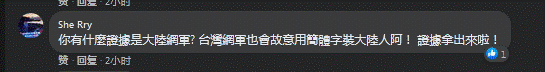 還有島內網友在台防務部門發言人臉書下質問:“你有什麼證據説是大陸網軍?台灣網軍也會故意用簡體字裝大陸人啊!證據拿出來啦!”