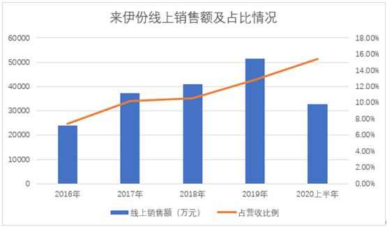 事實上,近年來來伊份線上渠道銷售額不斷攀升。2016-2019年,來伊份線上銷售額複合增長率28.99%,佔營業收入的比例由2016年的7.42%提升至2020H1的15.37%。