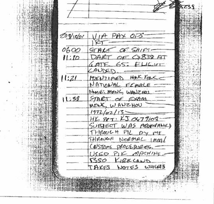 辯方律師指出,邊境服務局幾位證人的工作筆記,缺失的還有幾個重大信息,這包括:孟晚舟當天是否要入境加拿大、他與上級的那個電話、孟晚舟和華為公司對加拿大國家安全的威脅、加拿大聯邦警察將要逮捕孟晚舟。