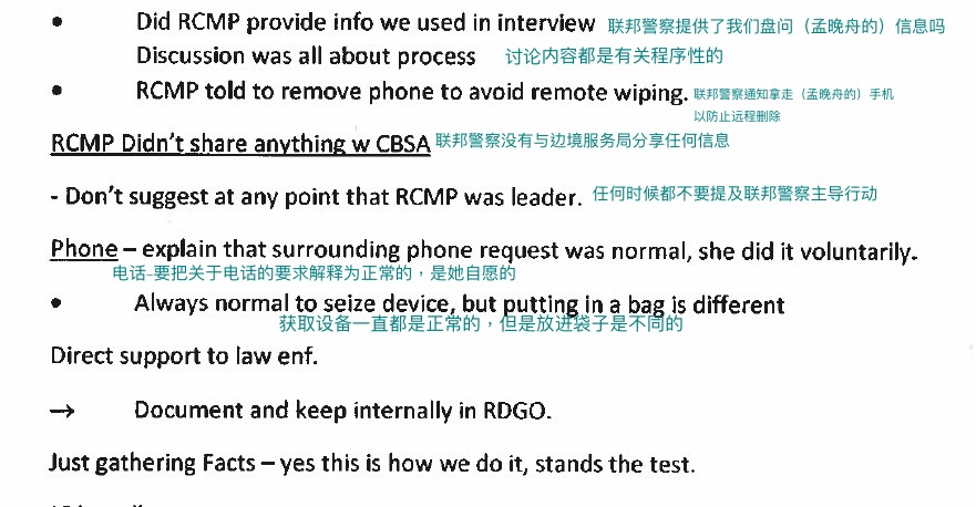 莫爾科在社交媒體上説,這頁文件與邊境服務局高層與卡特拉加達的一次會面有關。從內容上不難看出,這顯然是在事後為逮捕孟晚舟的過程統一口徑。