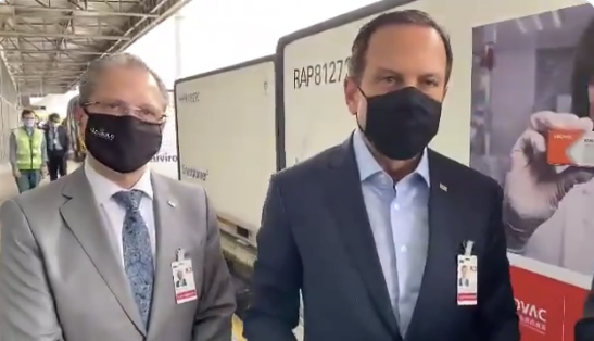 聖保羅州長多里亞(右)在機場迎接疫苗。圖源:多里亞推特