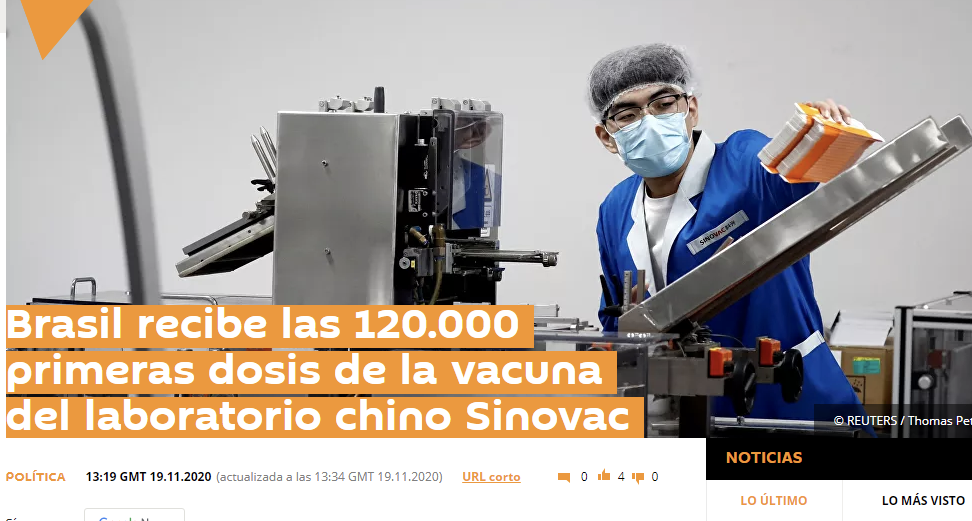 俄羅斯衞星通訊社:巴西收到中國科興公司首批12萬劑疫苗