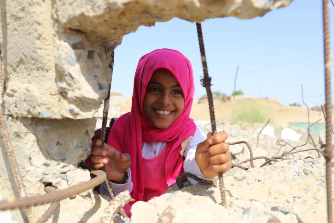 ▲11月11日,也門哈傑省米迪區,一名女孩在學校建築的廢墟中玩耍。(穆罕默德·阿爾瓦菲攝)