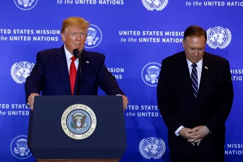 2019年9月25日,在美國紐約,美國總統特朗普和國務卿蓬佩奧出席新聞發佈會。新華社記者 李木子 攝
