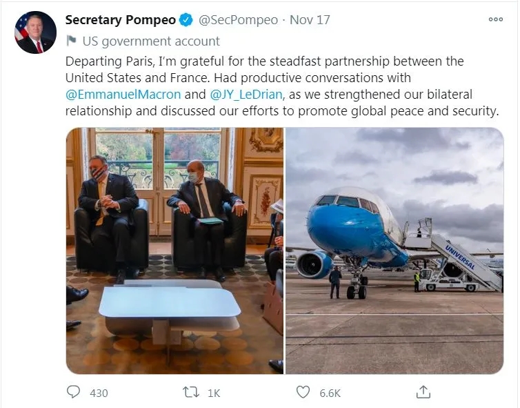 蓬佩奧在與法國總統馬克龍和勒德里昂會晤後,以及在離開法國時,發了三條熱情洋溢的推文,盛讚美法關係,並@馬克龍和勒德里昂。然而,兩個被@的官方賬號不僅沒有回應蓬佩奧,甚至連蓬佩奧到訪這事都沒提到。法國外交部的賬號也一張圖都沒“意思意思”。