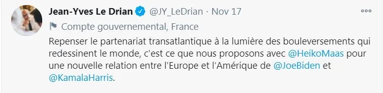 這還不算完。就在被蓬佩奧@了大約兩個小時後,勒德里昂發了一條推文@拜登和哈里斯,稱要“重新思考跨大西洋關係”。