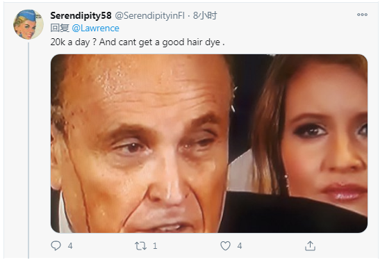 有網友提到朱利安尼給特朗普打競選官司一天收2萬的事情。此前有美媒報道,朱利安尼要求特朗普競選團隊每天支付2萬美元的法律服務費。不過對於相關報道,朱利安尼予以否認。