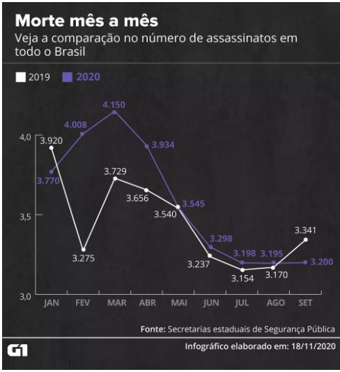 當地時間19日,巴西全國26個州和首都巴西利亞所在聯邦區的最新統計顯示,雖然在新冠疫情期間,各地區採取了相應社會隔離措施,出行人數和社會活動減少,但今年前9個月,全國謀殺案件數量較去年相比仍增加了4%。據統計,今年1至9月相關案件數量共計32298件,而去年同期數量為31022件,上升1276件。