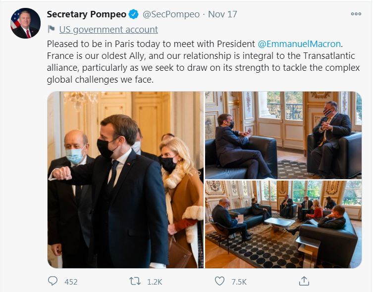 蓬佩奧在與法國總統馬克龍和勒德里昂會晤後,以及在離開法國時,發了三條熱情洋溢的推文,盛讚美法關係,並@馬克龍和勒德里昂。然而,兩個被@的官方賬號不僅沒有回應蓬佩奧,甚至連蓬佩奧到訪這事都沒提到。法國外交部的賬號也一張圖都沒“意思意思”。