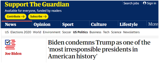 《衞報》稱,雖然拜登表示,自己並不擔心特朗普拒絕承認選舉結果的舉動會阻止權力移交,但他緊接着指責説,“一些令人難以置信的破壞性信息正被傳遞到世界其他地方”。