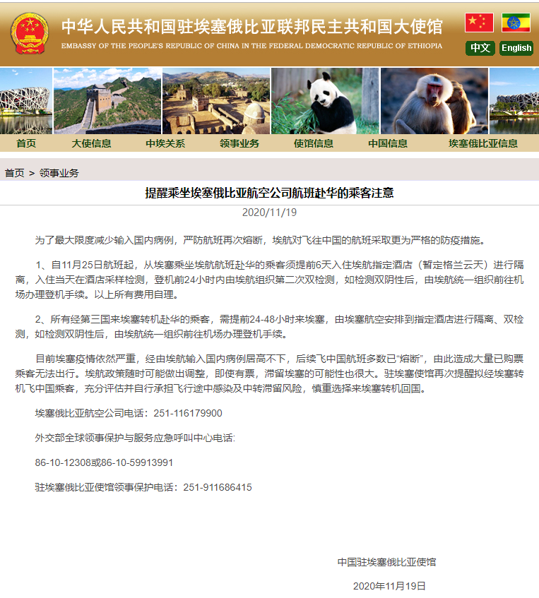 11月19日,中國駐埃塞俄比亞大使館發佈領事提醒:
