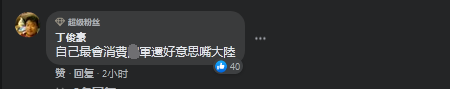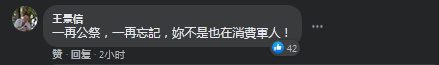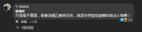 台媒報道此事後,在社交媒體上,有島內網友隨即諷刺道,“(你)自己最會消費台軍還好意思説大陸。”“一再公祭,一再忘記,你不是也在消費軍人!”“你的網軍很(經)常消費台灣人”↓