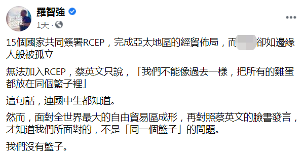 對此,國民黨籍台北市議員羅智強19日、20日接連在臉書發文稱,15個國家共同簽署RCEP,完成亞太地區的經貿佈局,而台灣卻如邊緣人般被孤立無法加入RCEP,蔡英文只説,“我們不能像過去一樣,把所有的雞蛋都放在同個籃子裏”。這句話,連初中生都知道。然而,面對全世界最大的自由貿易區成形,再對照蔡英文的臉書發言,才知道我們所面對的,不是“同一個籃子”的問題。而是“我們沒有籃子”。