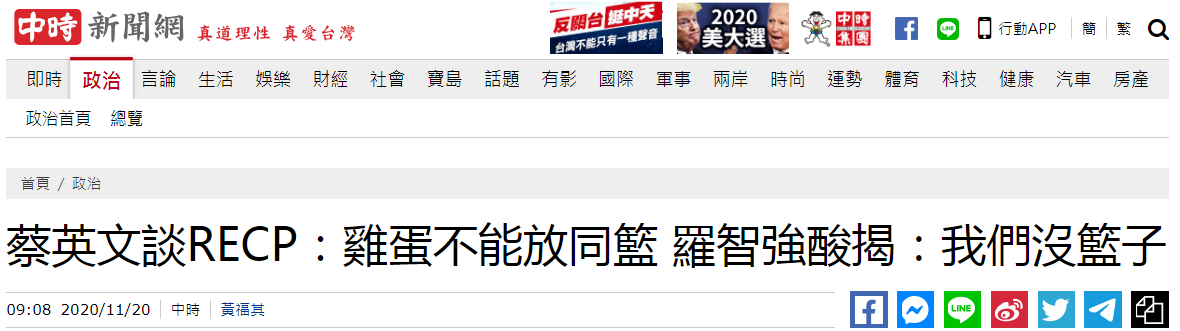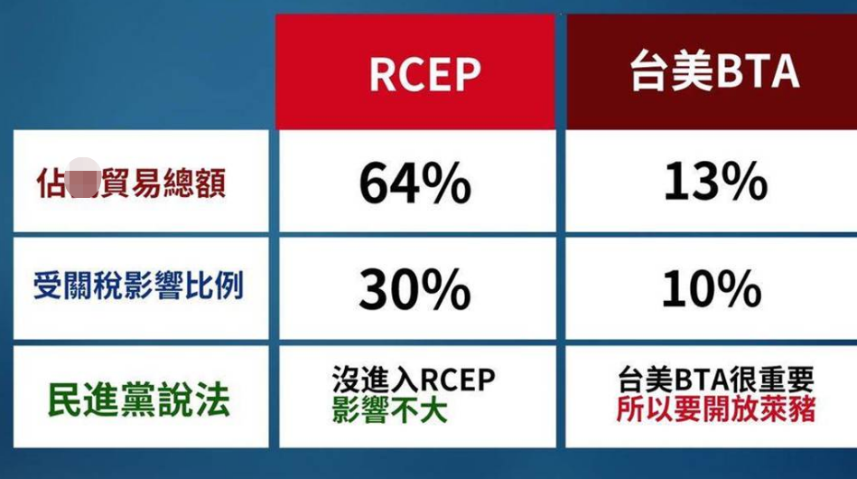 亞太15國簽署區域全面經濟夥伴關係協定(RCEP),全球最大的自由貿易區誕生,台灣地區卻不在其中。據台灣中時新聞網報道,對此,民進黨當局説衝擊不大,蔡英文也説“不能把所有雞蛋放在同個籃子”;對於開放萊豬(含有瘦肉精的美國豬肉),民進黨當局則稱有利台美“雙邊貿易協定” (BTA)。