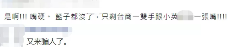對於台灣未能加入區域全面經濟夥伴關係協定(RCEP),蔡英文11月17日曾在臉書發文,聲稱關於RCEP議題,負責任的“執政者”必須告訴人民國際經貿局勢的發展,為台灣做出正確的佈局。“我們不能像過去一樣,把所有的雞蛋都放在同(一)個籃子裏,所以我們一直多方嘗試,為台灣開拓更多機會。”她還稱,“台灣早就已經超前部署,做好了調適”云云。對此,有島內網友諷刺蔡英文“嘴硬”:“籃子都沒了,只剩台商一雙手跟小英一張嘴!”“問題是每個籃子都沒有你”。↓