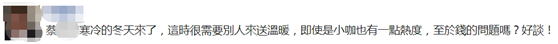 還有網友諷刺説,民進黨當局寒冷的冬天來了,這時很需要別人來送温暖,即使是小咖也有一點熱度,至於錢的問題嗎?好談!↓