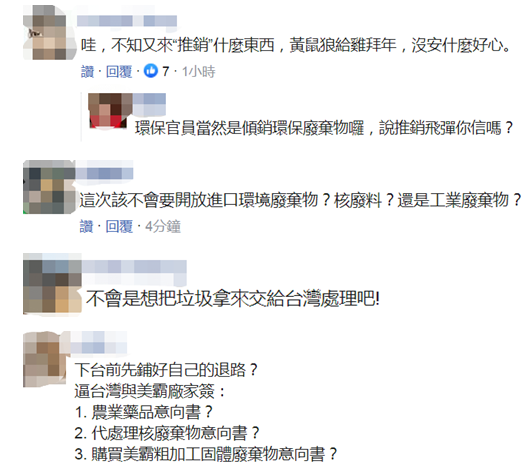 對此,島內網友批評稱,不知道美國又來“推銷”什麼東西,“沒安什麼好心”。不少網友有點擔心:“這次該不會要開放進口環境廢棄物?核廢料?還是工業廢棄物?”“不會是想把垃圾拿來交給台灣處理吧?”↓