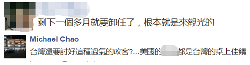 有網友説,惠勒剩下一個多月就要卸任了,“(他)根本就是來觀光的。”“台灣還要討好這種過氣的政客嗎?”↓