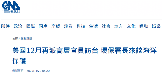 據台灣“中央社”“聯合新聞網”等台媒援引《紐約時報》報道稱,根據美國環保署、美國在台協會(AIT)文件及未具名消息人士説法,惠勒(Andrew Wheeler)預定12月5日當週訪台3天,團員總數為10人。惠勒發言人修伊特説,惠勒應邀赴台就“拯救我們的海洋”倡議與海洋垃圾、空氣質量、兒童健康等議題推展合作。至於惠勒此行是否與台灣高層官員會面,知情人士表示尚未敲定。