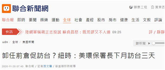《紐約時報》稱,美國“當選總統”拜登將在明年1月20日就任美國總統,在此之前,惠勒將在12月訪問台灣,明年1月再訪4個拉美國家,引發濫用公款疑慮。報道稱,為避免隔離,包機到台灣得花費至少25萬美元,預計從12月5日起的3天訪問行程,10人代表團得花費約4.5萬美元。