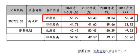 *新城市業務側重華南,政府類客户佔比高於蕾奧規劃。*年報數據顯示,新城市2019年在華南地區收入佔比為87.30%,是最主要的收入來源,此外在西南、華東也有少量的業務佈局。新城市與蕾奧規劃同為民營企業,但新城市的政府類客户收入佔比要更高,具體數據見下圖。
