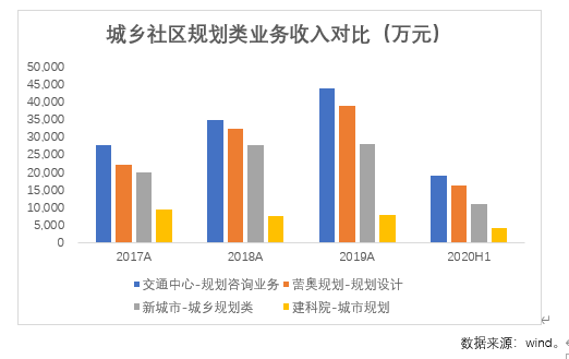 今年IPO的4家規劃設計企業中,奧雅設計側重景觀設計(2019及2020上半年景觀設計收入佔比分別為75.22%和83.27%),深水規院側重勘測設計(2019及2020上半年勘測設計收入佔比分別為64.03%和63.72%)。城鄉社區規劃類業務方面,我們重點對比了4家上市公司相關業務的收入情況。