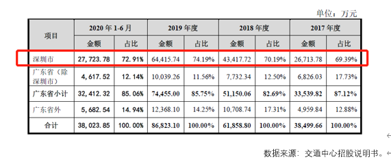 *交通中心**聚焦深圳本地市場,政府類客户較多。*下圖列出了交通中心的收入構成,可以看出交通中心近兩年在深圳市內的業務收入佔比均達到70%以上。2020年上半,交通中心前五大客户依次為深圳市交通運輸局、深投控、深圳市前海開發投資控股有限公司、深圳市公安交通警察局、深圳市福田區建築工務局,均為深圳市的國資背景客户,這與交通中心的國資背景應該有一定的關係。