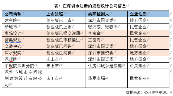 城市規劃設計企業大體上可以分為全國性的大型企業和區域性的中小企業。就深圳市場來説,目前在深圳註冊了多家規劃設計公司,主要公司的情況如下表所示。建科院、新城市已經成功登陸創業板,今年以來又有4家企業陸續進入IPO階段,民營背景的奧雅設計、蕾奧規劃均已經通過發審委的審核,進展相對順利。