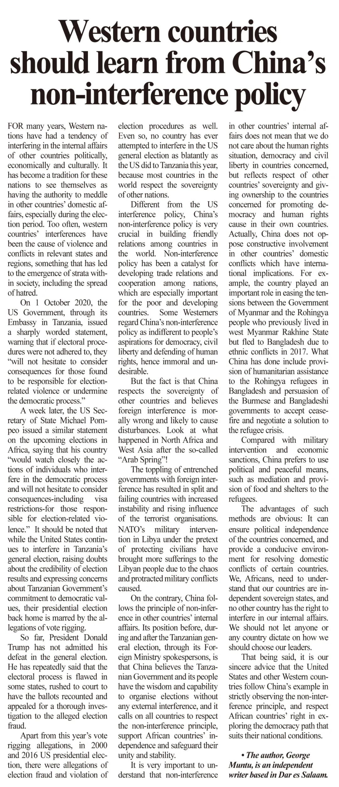 11月19日,坦桑尼亞主流媒體《每日新聞》刊登坦時政專家喬治·門圖的評論文章,題為《西方國家應當效仿中國不干涉別國內政》。文章主要內容如下: