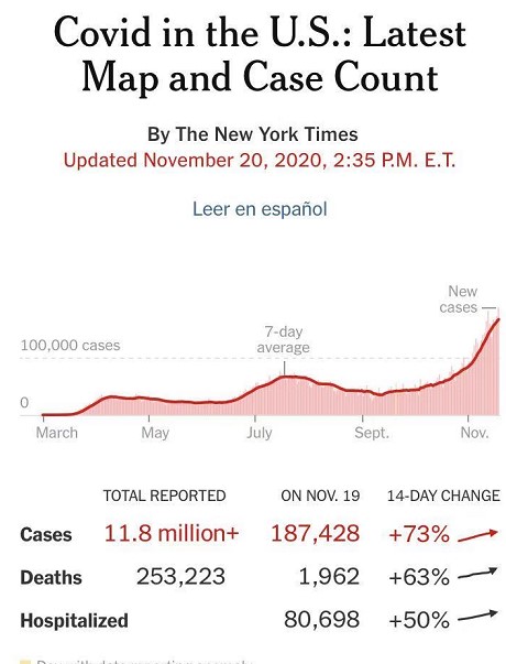 11月19日,美國報告單日新增新冠肺炎確診病例超過18.7萬例,再次打破紀錄。這與美國首次報告日增10萬確診病例相隔僅三週。《紐約時報》指出,“這個驚人的數字表明,病毒傳播已經失控。”